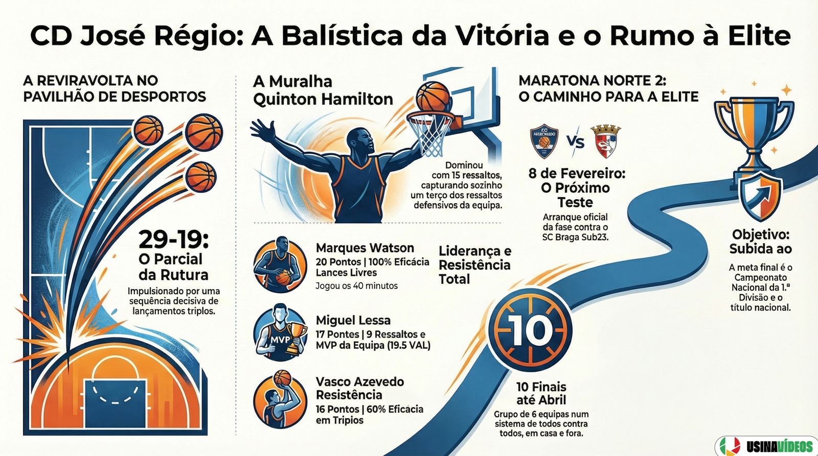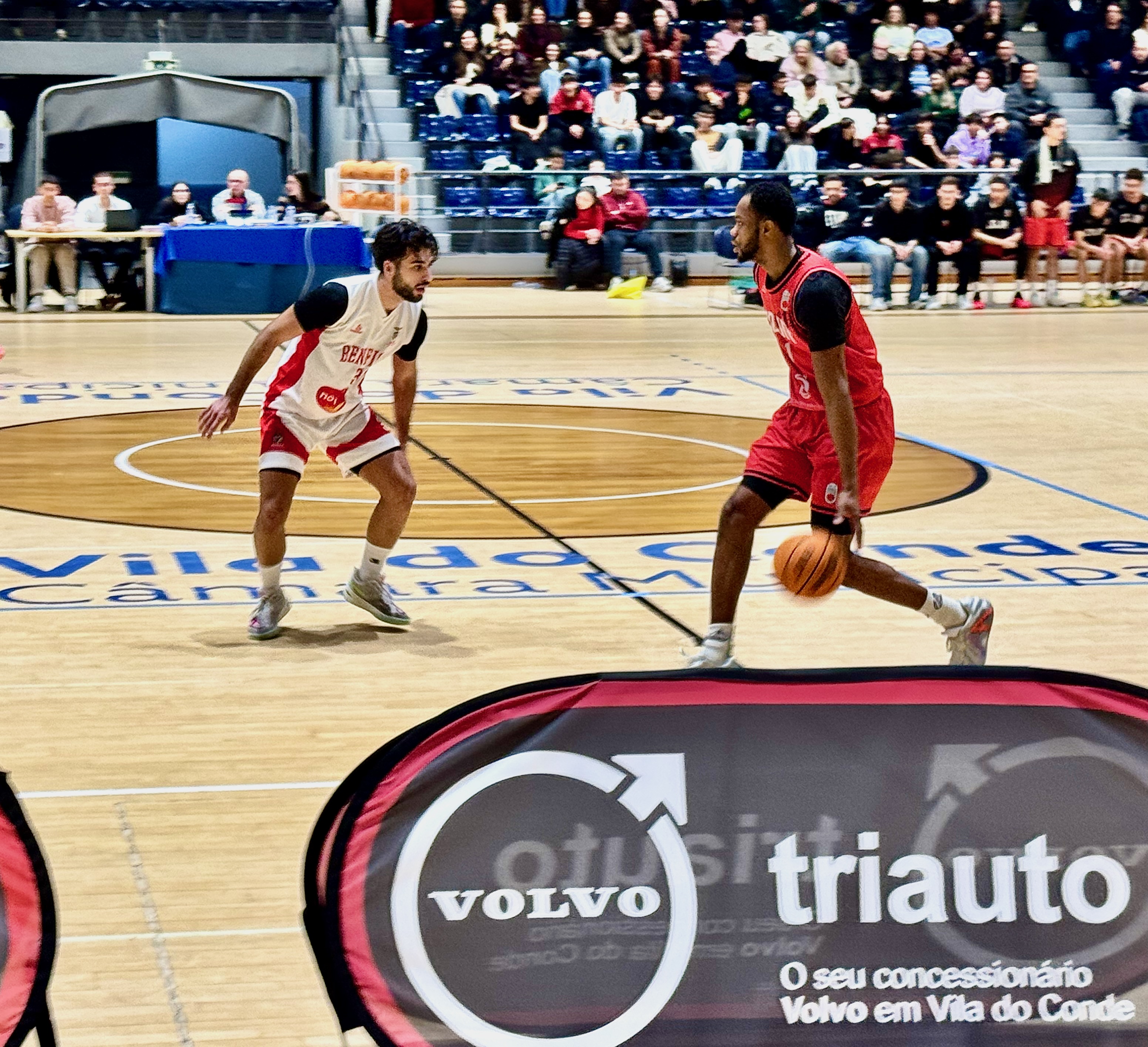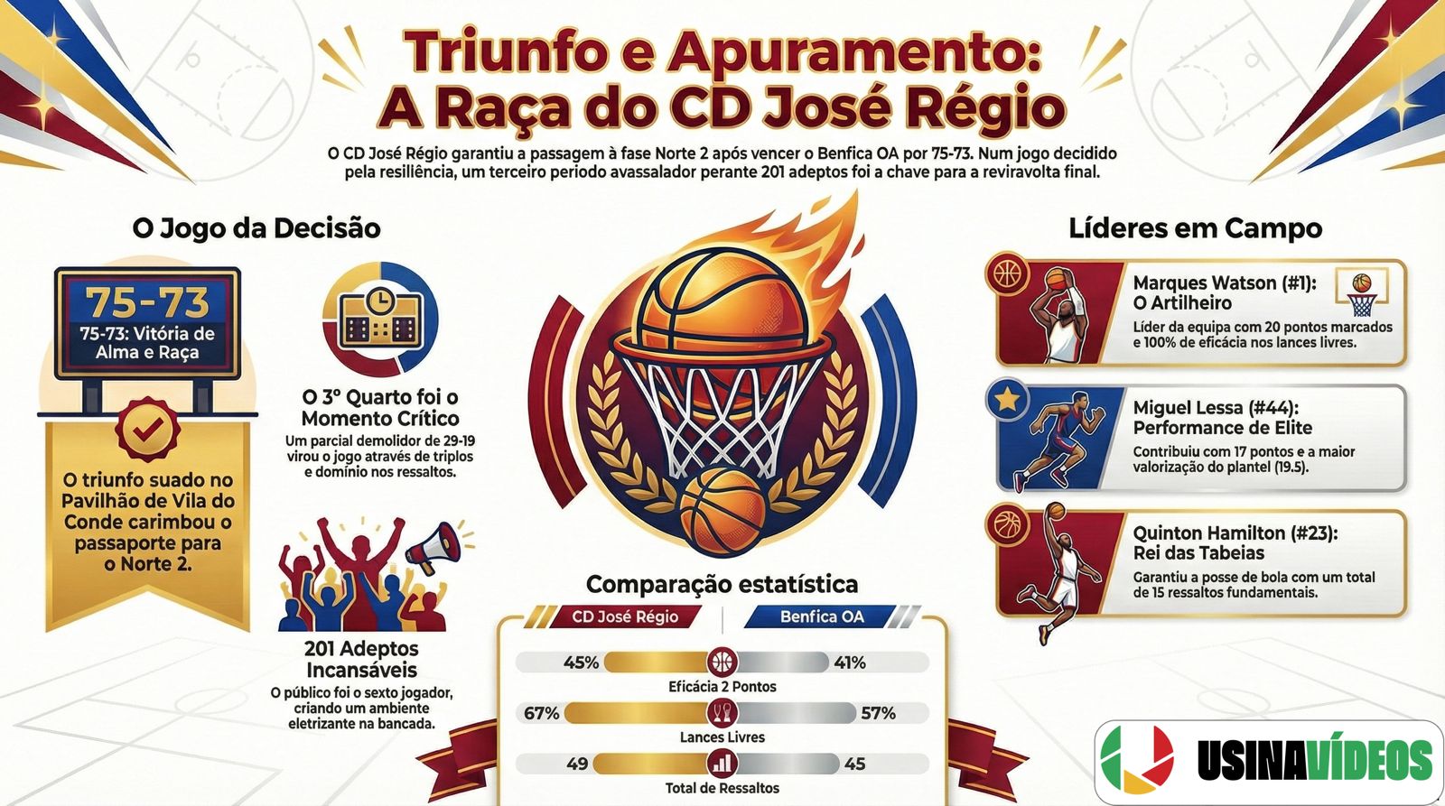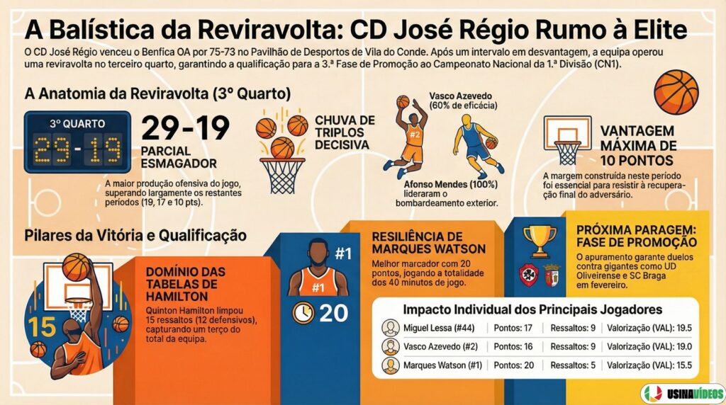 A Reviravolta de 10 Minutos O jogo não começou fácil. A perder ao intervalo (36-38) e com o espectro da eliminação a pairar, foi necessária uma mudança radical de atitude e tática. O “clique” deu-se no terceiro quarto. Comandados pela estratégia de André Silva, a equipa disparou um parcial impressionante de 29-19. Foi uma tempestade perfeita: a eficácia nos triplos de Vasco Azevedo (60% de eficácia) e a liderança de Miguel Lessa (MVP com 19.5 de valorização) destruíram a defesa encarnada,.