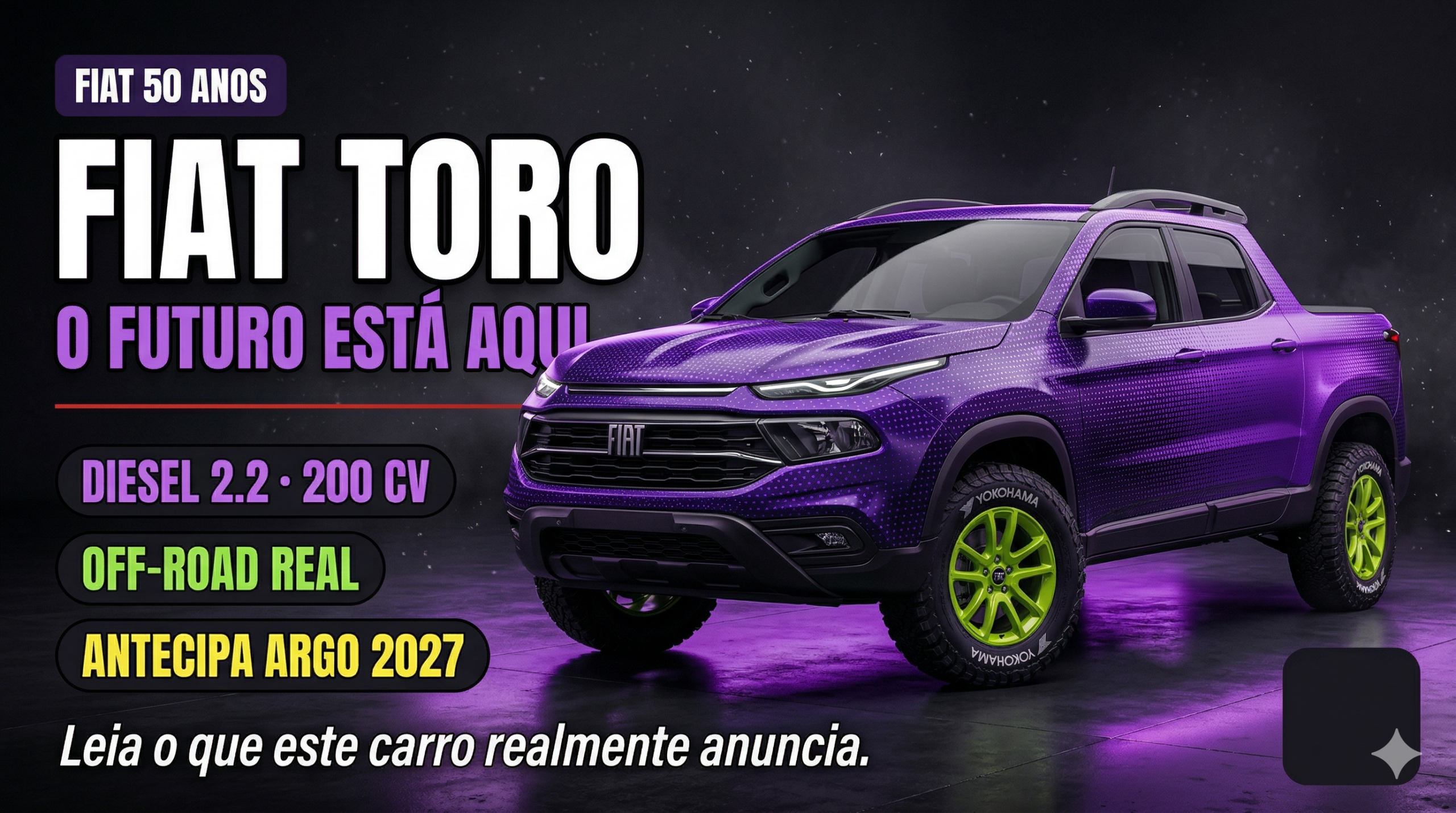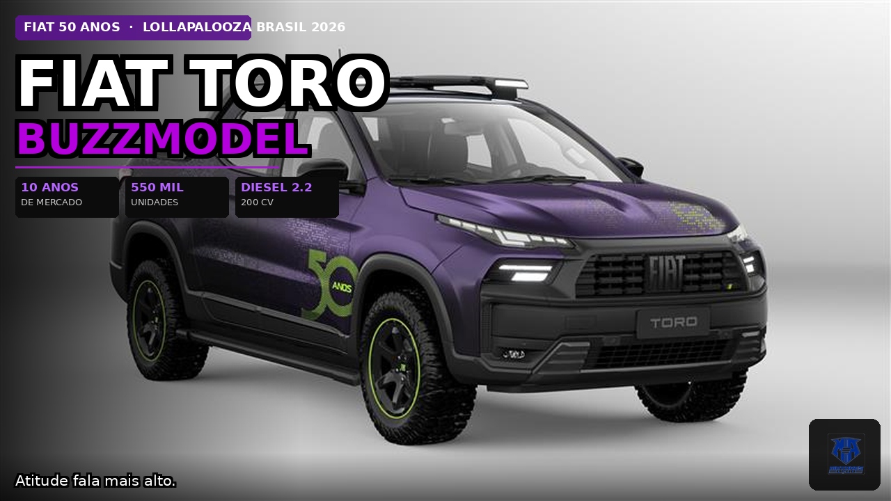 Fiat Toro Lollapalloza 2026 antecipa o futuro da marca no Brasil. Este carro não está à venda. Mas diz mais sobre o futuro da Fiat do que qualquer press release dos últimos três anos. Nos dias 20, 21 e 22 de março de 2026, no Autódromo de Interlagos em São Paulo, a Fiat expôs este exemplar único da Toro como peça central das comemorações dos seus 50 anos no Brasil — celebração oficial a 9 de julho. Por baixo da carroceria roxa em degradê, há muito mais do que marketing de festival.