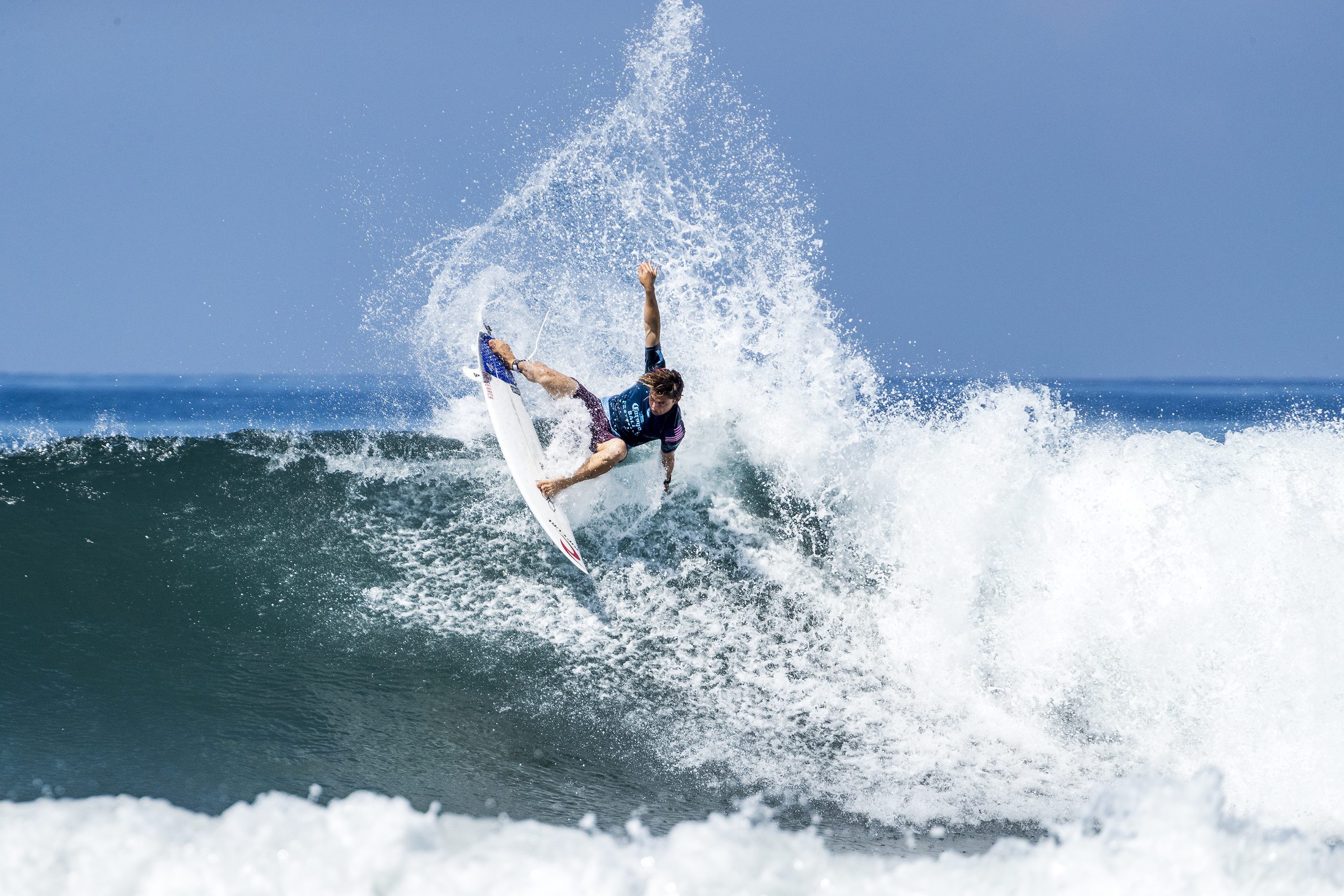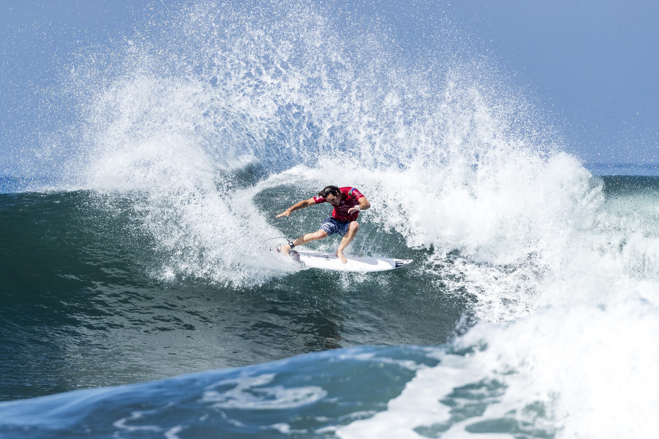 E DEPOIS DE UM DIA DE FOLGA, OS HOMENS VOLTARAM ÀS ONDAS NESTA QUINTA 31 DE MAIO. E FORAM SEIS VITÓRIAS BRASILEIROS EM 12 BATERIAS. A primeira vitória foi do paulista Jessé Mendes// Ele superou o bicampeão mundial John John Florence com uma virada sensacional e espetacular no final da bateria// Jessé arriscou tudo em um super aéreo e foi feliz// Impressionante, hein Jessé?