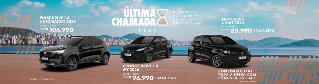 E aí, galera apaixonada por motores? Em 29 de dezembro de 2025, rolou a live AO VIVO no Motores e Ação revelando as promoções bombásticas de fim de ano da Fiat – o jeito perfeito de encerrar o ano com um carro zero km na garagem! Do Pulse Drive 1.3 Automático por apenas R$ 106.990 ao Argo Drive 1.0 por R$ 85.990 + taxa zero, passando por Cronos Drive 1.3 por R$ 96.990 + taxa zero e condições exclusivas na Titano para CNPJ. Essas ofertas são válidas até 31 de dezembro de 2025 ou enquanto durarem os estoques – corra para uma das 500 concessionárias Fiat!