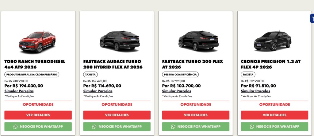• Argo Drive 1.0: Por R$ 85.990 + taxa zero em até 24x. Hatch compacto com espaço para família, motor flex econômico e conectividade sem fio (Android Auto/Apple CarPlay).